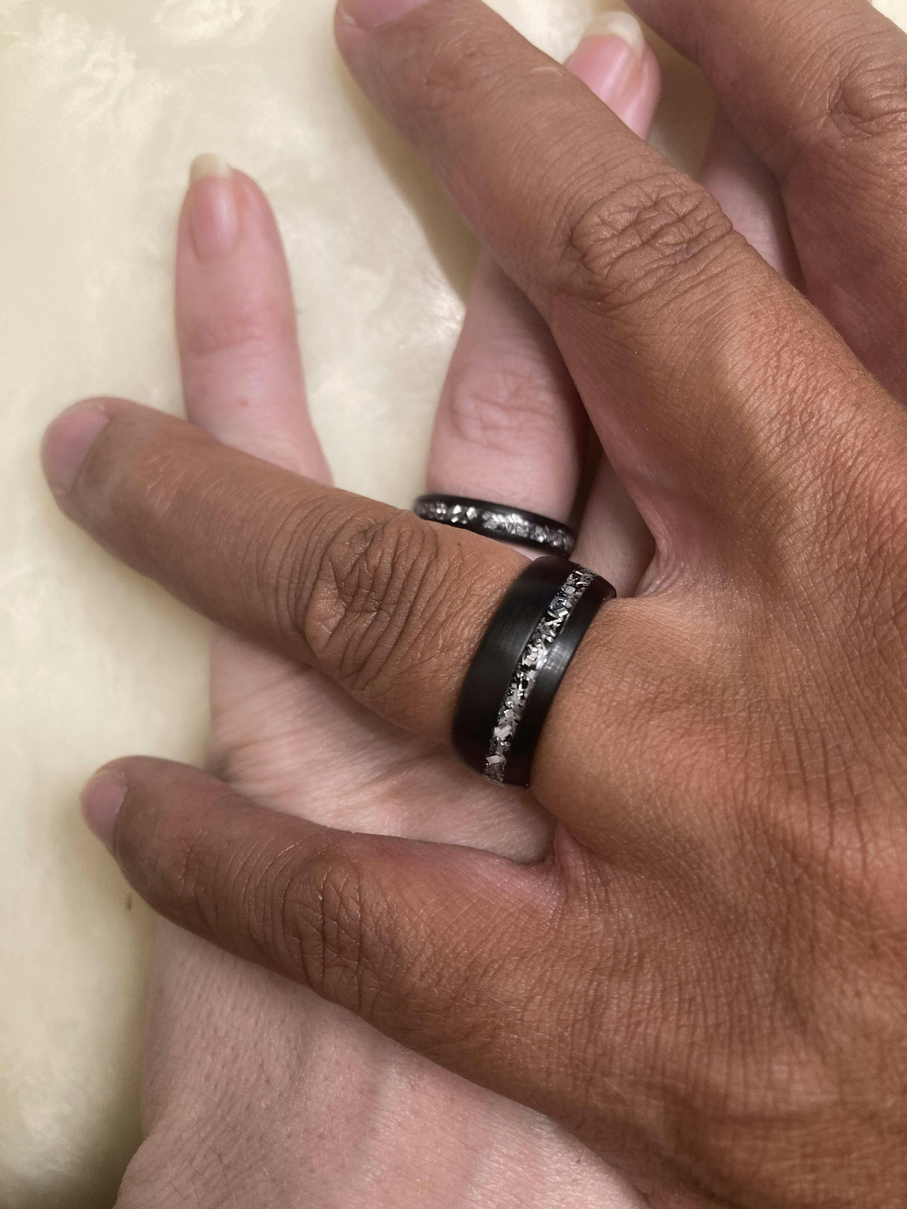 This black brushed tungsten carbide meteorite ring was so popular, it's now available in a matching couples set! It is an 8mm and 4mm Brushed Black Tungsten Carbide with Crushed Meteorite Wedding ring set, that has real meteorite placed in each channel.
